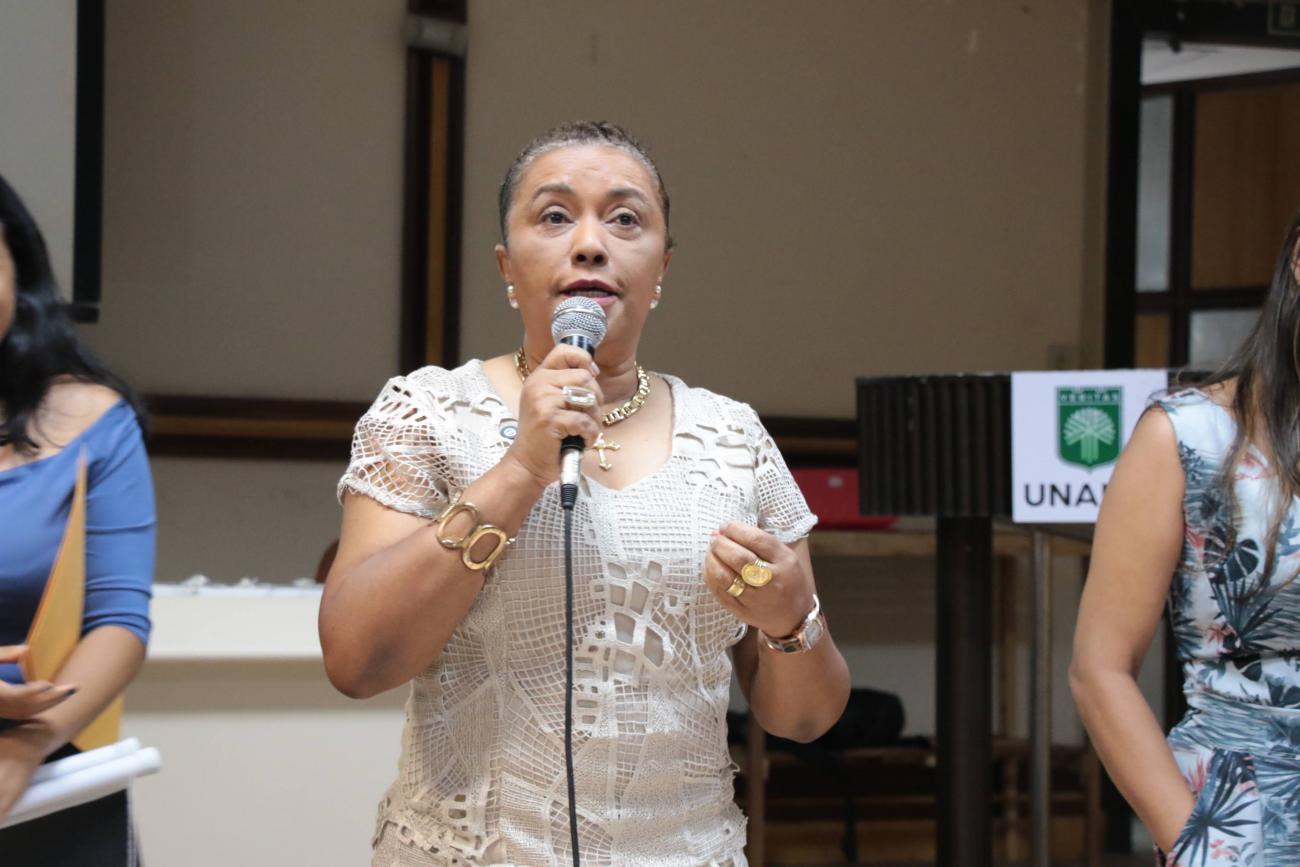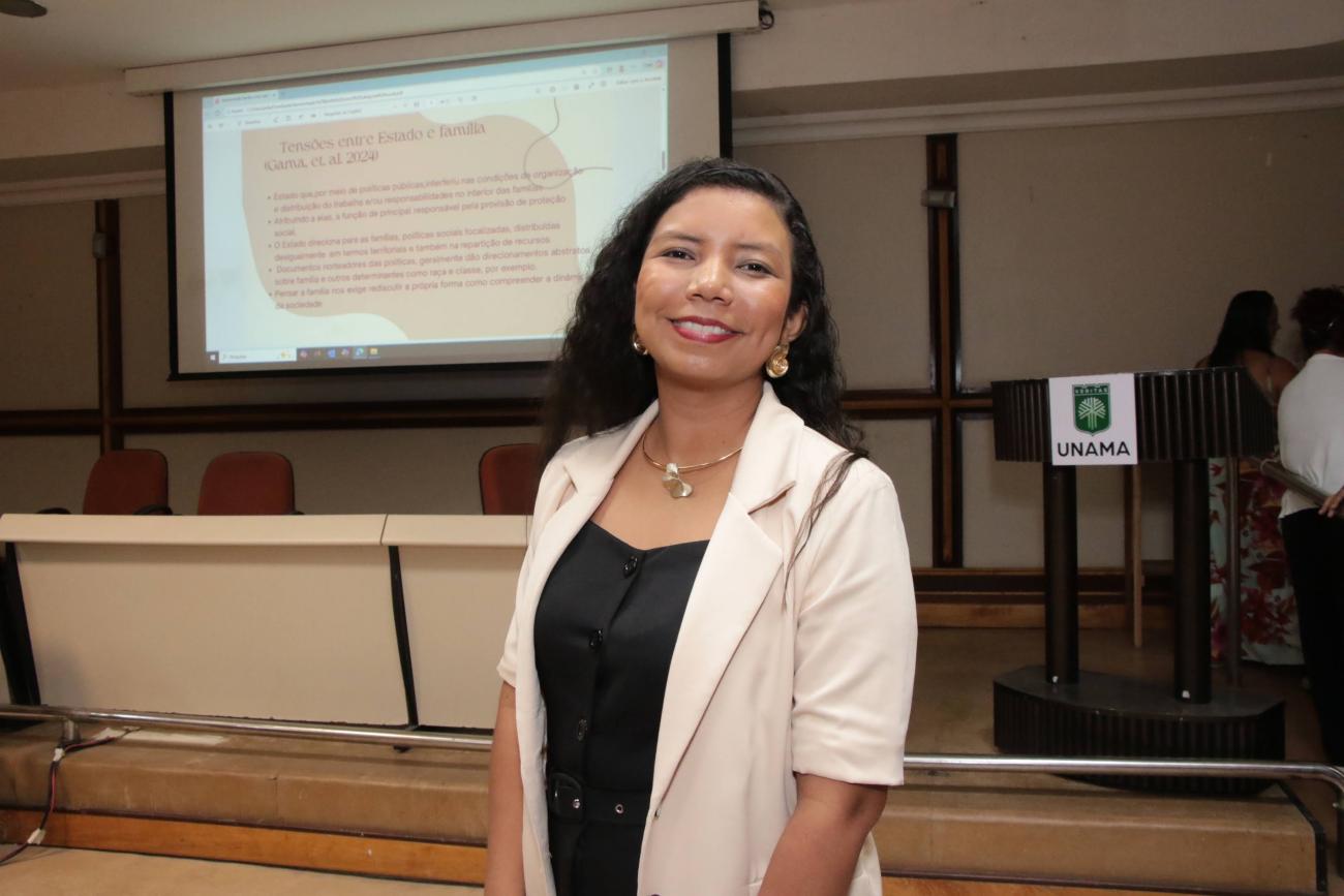 Profa. Dra. Amanda Costa, palestrante.A Profa. Dra. Amanda Costa abriu o ciclo de palestras abordando os temas “Os determinantes e as multifacetas das violências e violações de direitos” e “Família como categoria social e suas configurações contemporâneas”.