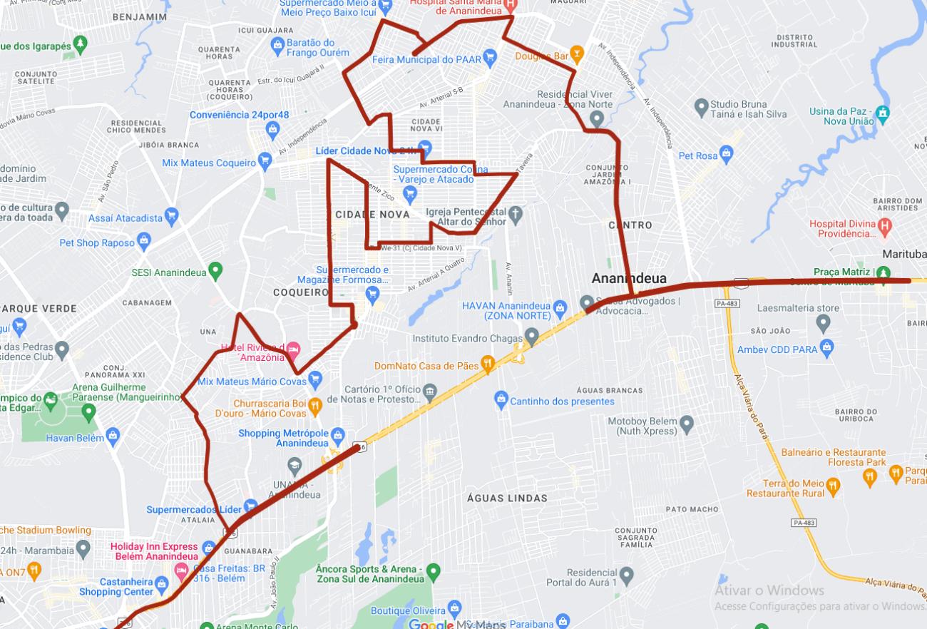 Área da Almirante até a Unimed BR - (com paradas em Homenagem no Shopping Castanheira; e pra almoço na UNAMA - BR) - R. São Benedito - P. Jarbas Passarinho - Rod. Transcoqueiro - Rod. Mário Covas - Av. Três Corações - Rotatória da Praça da Bíblia - Est. da Providência - Tv. WE 16 - R. da Providência - Av. Dom Vicente Zico - Tv. SN 03 - Tv. WE 31 - Av. Dr. Nonato Sanova (WE-17) - Tv. WE 32 - Tv. SN 19 -Av. Dom Vicente Zico - Tv. WE 53 - Av. Milton Taveira - Tv. WE 68 - Tv. SN 21 - Tv. WE 72 - Tv. WE 23 - Tv. WE 75 - Tv. SN 24 - Av. Arterial 5 - Est. do Icuí Guajará - R. Santa Fé - R. Jovelina Carneiro - Est. do Guajará - Av. Independência (1 retorno) - Av. Independência - Av. Arterial 5-A - Av. Rio Solimões - Est. do Curuçambá - Av. Cláudio Sanders - BR 316 (até marituba ) - retorno BR 316 (Passagem em frente à Prefeitura e parada na Igreja Matriz de Ananindeua - vigília).