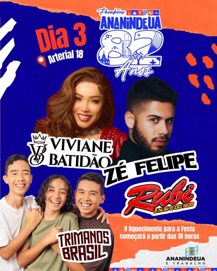 O Aniversário dos 82 anos de Ananindeua será muito especial com grandes atrações musicais, entre eles: Zé Felipe, Viviane Batidão, Trimanos e Aparelhagem Rubi - A Nave do Som.