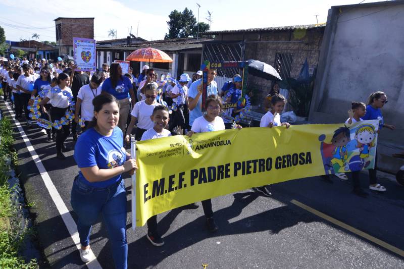 Educadores em busca de respeito e inclusão.A Escola Municipal Padre Pietro Gerosa realizou a II Caminhada da Conscientização sobre o Autismo na quinta-feira (10.04), pelas ruas do bairro do Aurá, em Ananindeua. O evento contou com a participação de 150 pessoas da comunidade escolar e teve como objetivo sensibilizar a comunidade do entorno para a importância da inclusão, do respeito às singularidades e apoio às famílias atípicas.